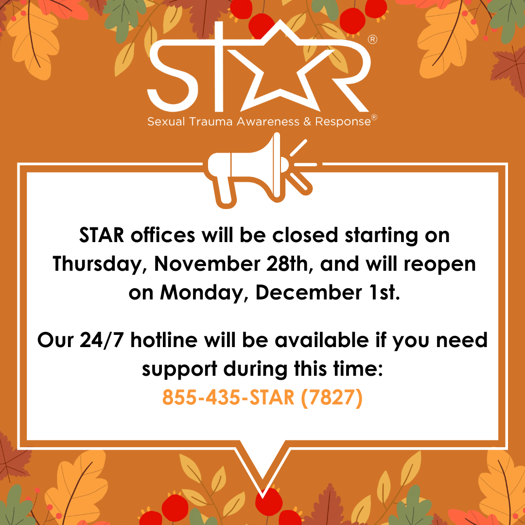 We will be closed on starting on Thursday, November 28th and will reopen on Monday, December 1st in observance of Fall Break. Our 24/7 hotline will be available if you need support during this time: 855-435-7827